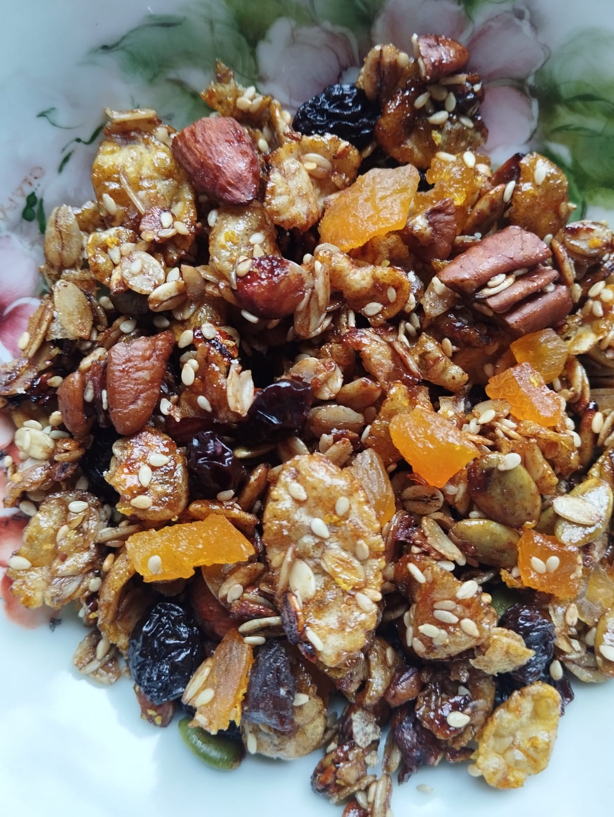 Ingredientes: Aveis, flocos de milho, nozes pecan, amendoas, semente de abóbora, gergelim, damasco, uva passa, canela, gengibre, raspas de laranja, melado, óleo de girassol e sal.